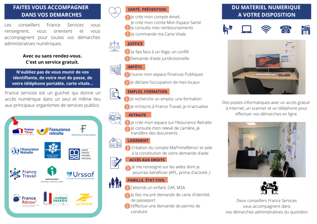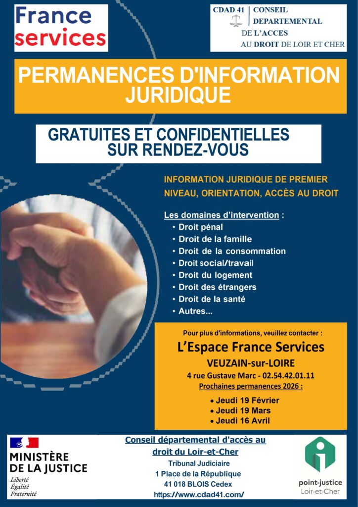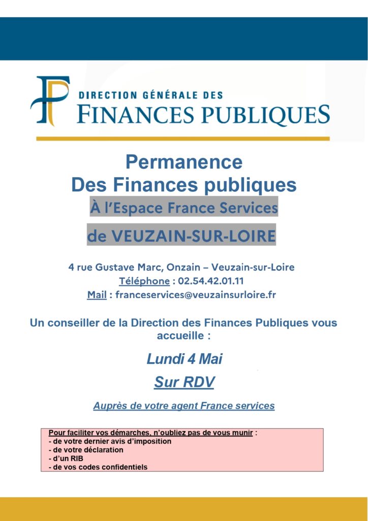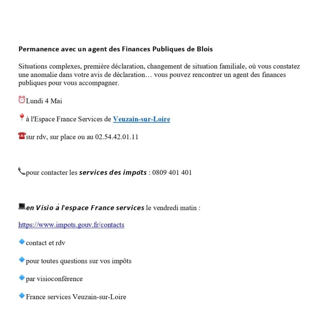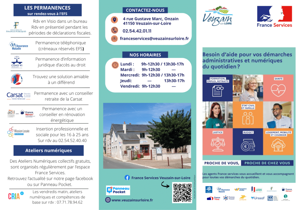 Prise de rdv à l’Espace France Services au 02 54 42 01 11 – 4 rue Gustave Marc, Veuzain-sur-Loire