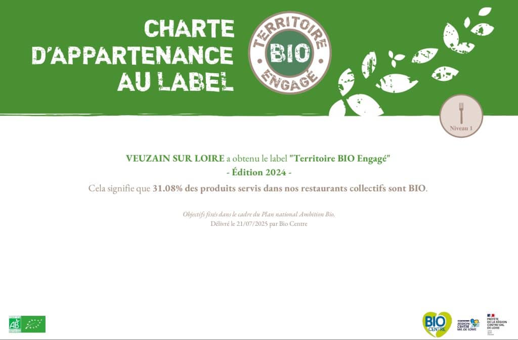 Pour la deuxième annĂ©e consĂ©cutive, notre restaurant scolaire de Veuzain-sur-Loire a dĂ©crochĂ© le label « Territoire Bio Engagé » avec une fourchette !Â